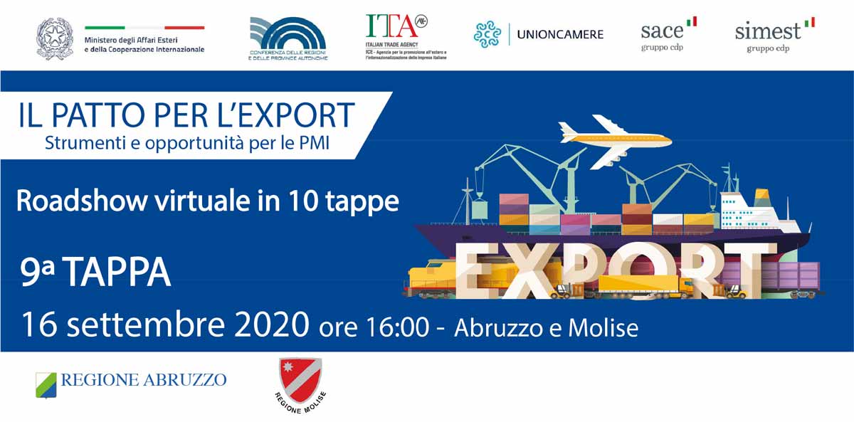 Il Ministero degli Affari Esteri e della Cooperazione internazionale (MAECI), ICE - Agenzia e SACE SIMEST, in collaborazione con la Conferenza delle Regioni e Unioncamere, invitano le aziende italiane a partecipare ad un ciclo di Roadshow virtuali, in programma dal 31 agosto al 18 settembre, dedicati alla presentazione del Patto per l'Export.