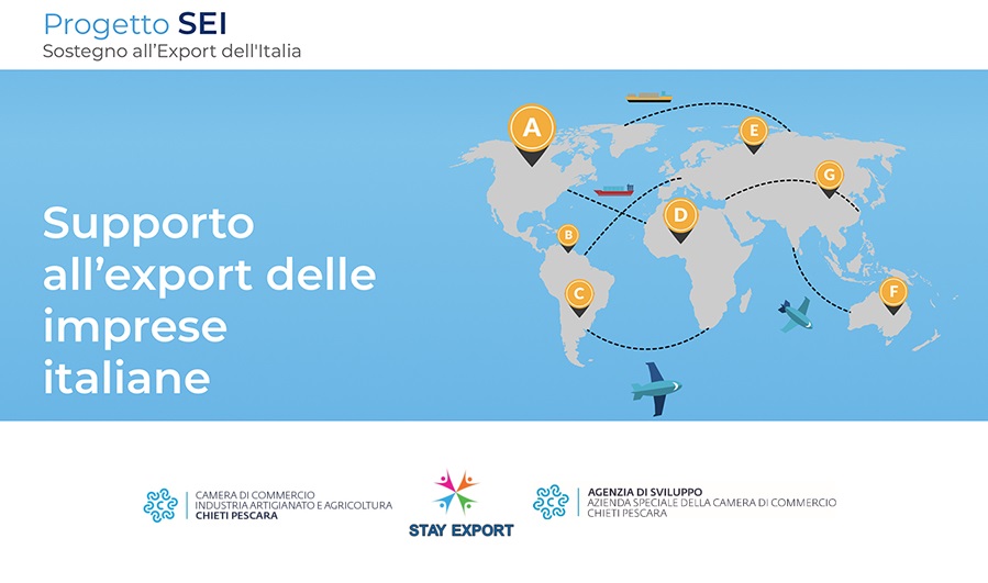 Nell'ambito del Progetto SEI, Sostegno all'Export, la Camera di Commercio Chieti Pescara in collaborazione con l'Agenzia di Sviluppo della Camera di Commercio Chieti Pescara, partecipa al progetto Stay Export, nato dalla collaborazione tra Unioncamere ed Assocamerestero con il coinvolgimento delle Camere di Commercio Italiane all'estero.