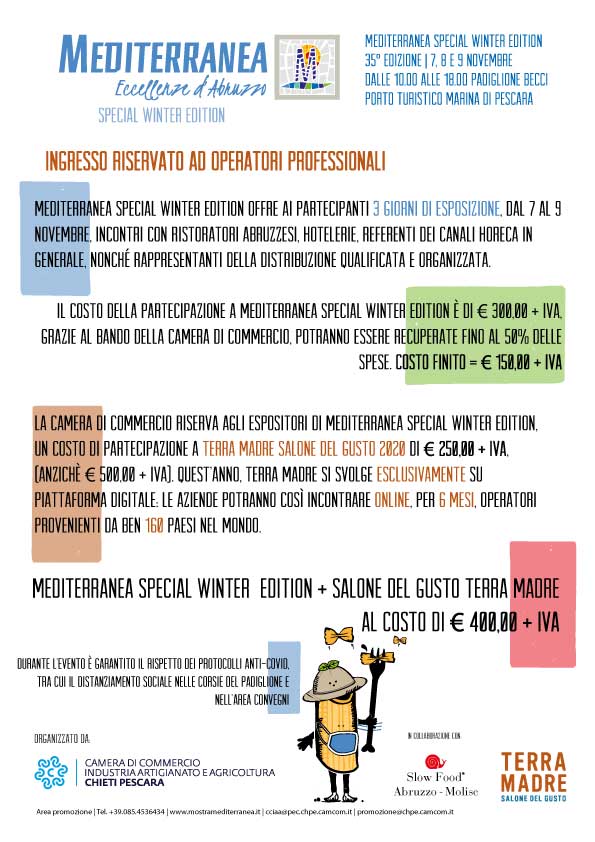 Mediterranea 2020 verrà inserita nel catalogo delle iniziative di Terra Madre Salone del gusto, con una pagina web dedicata alla Camera di commercio Chieti Pescara per far conoscere ad un pubblico internazionale i progetti portati avanti sul territorio focalizzando l’attenzione sul mondo produttivo e sul settore turistico e sfruttando questa opportunità come un’occasione di rilancio per il territorio e per le aziende che saranno inserite nel progetto.