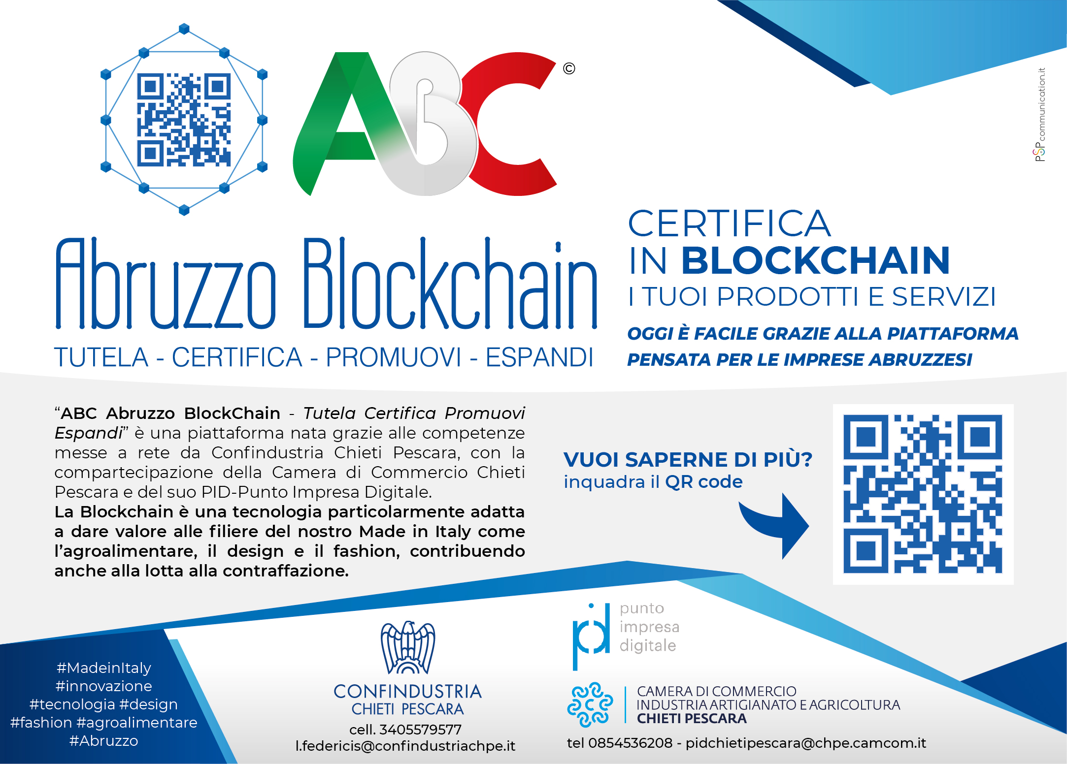 La Camera di Commercio Chieti Pescara, con il PID Chieti Pescara, compartecipa con Confindustria Chieti Pescara alla realizzazione del progetto “ABC Abruzzo BlockChain: Tutela, Certifica, Promuovi, Espandi” mettendo al servizio delle realtà produttive delle due province un'innovativa piattaforma di blockchain.