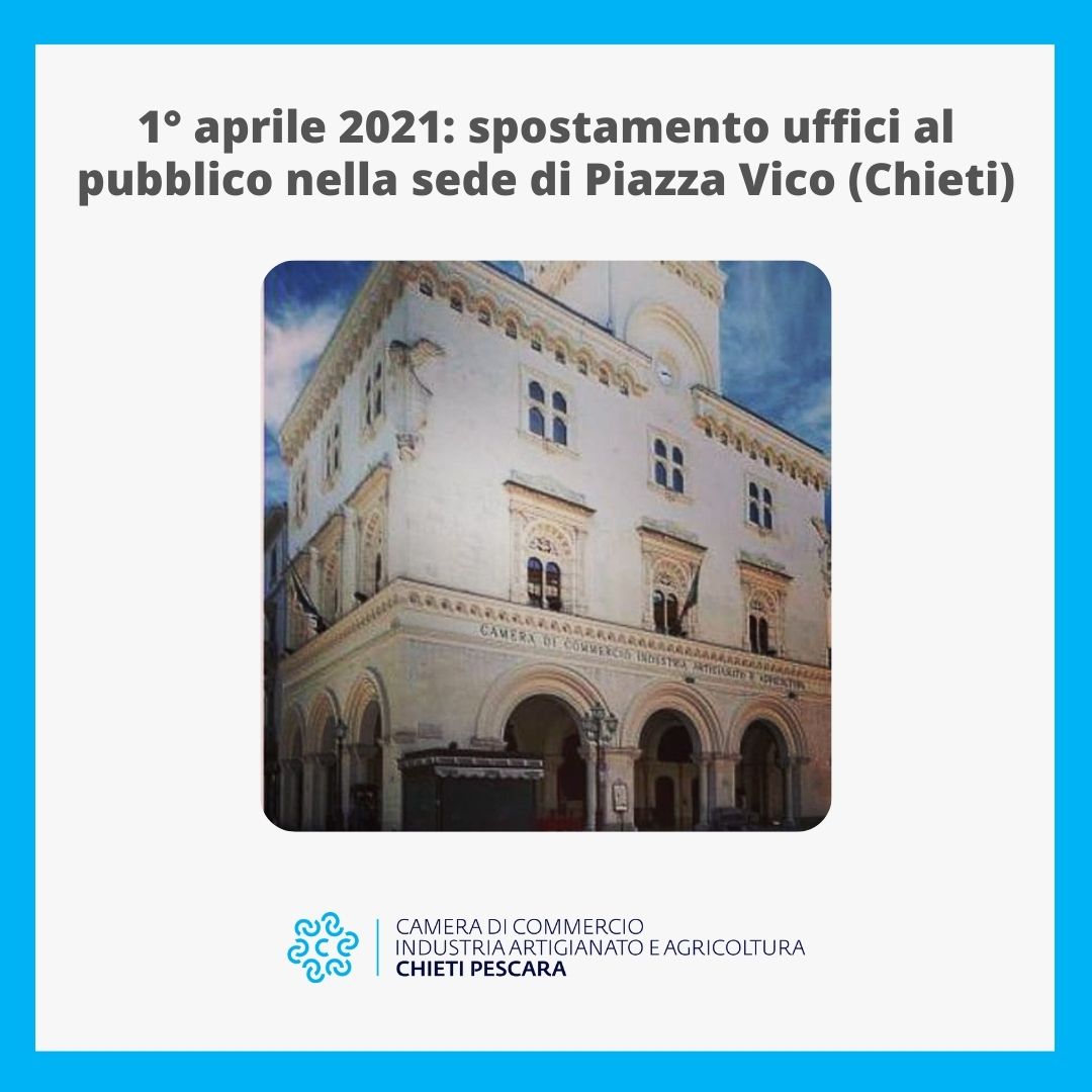 Dal primo aprile, per motivi di manutenzione straordinaria, tutti gli uffici al pubblico della sede di Chieti Scalo, in Via Fratelli Pomilio, saranno trasferiti temporaneamente nella sede della Camera di Commercio di Piazza Vico a Chieti.