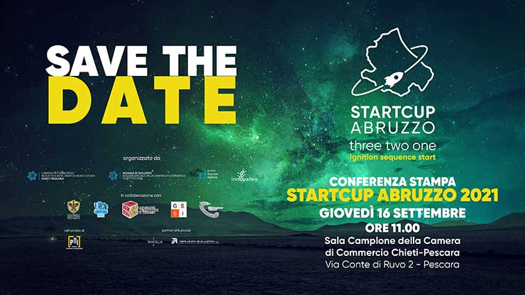 StartCup Abruzzo 2021 è organizzato dalla Camera di Commercio Chieti Pescara, dall’Agenzia di Sviluppo della Camera di Commercio Chieti Pescara, dall’Associazione Innovalley e coinvolge tutti gli Atenei Abruzzesi.