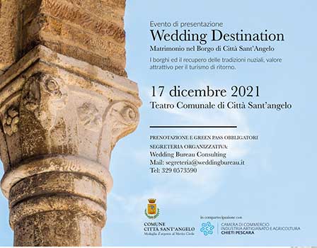 Venerdì 17 dicembre 2021, dalle ore 9:00 alle ore 12:00, nel Teatro Comunale di Città Sant’Angelo, sarà presentato ufficialmente il progetto turistico “Matrimonio nel Borgo di Città Sant’Angelo” promosso dal Comune angolano, con la compartecipazione della Camera di Commercio di Chieti-Pescara.