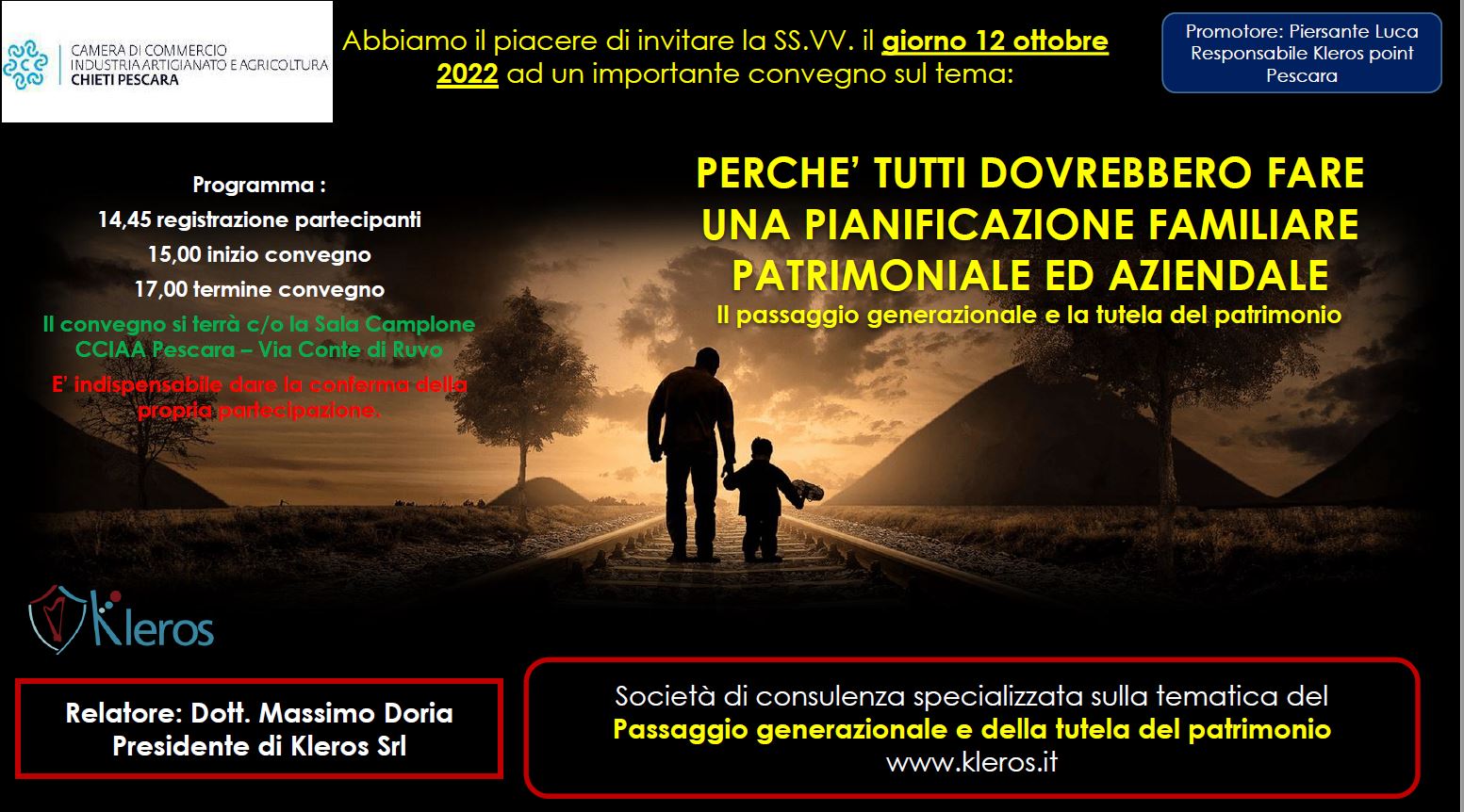 Il prossimo 12 ottobre , dalle ore 15,00, nella Sala Camplone della Camera di Commercio Chieti Pescara si parlerà di pianificazione familiare patrimoniale ed aziendale.