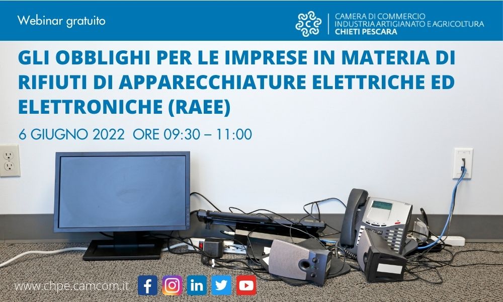 Unioncamere e Centro di coordinamento RAEE in collaborazione con la Camera di Commercio Chieti Pescara ed Ecocerved, organizzano un webinar sui Rifiuti Elettrici ed Elettronici rivolto alle aziende che immettono sul mercato italiano apparecchiature elettriche ed elettroniche