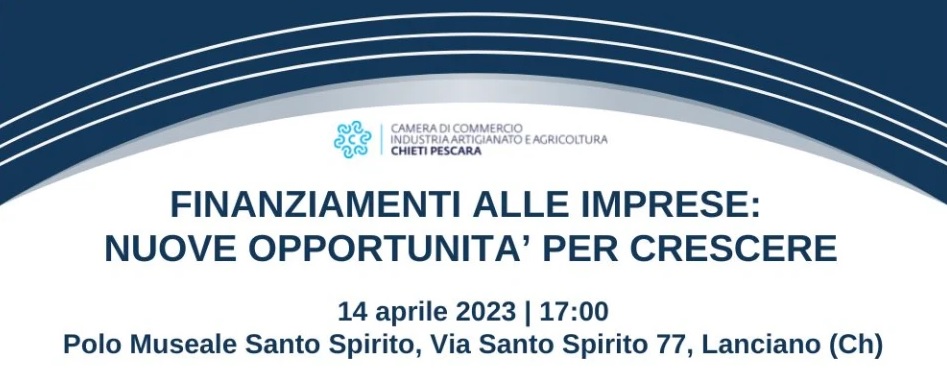 Venerdì 14 aprile 2023 dalle 17:00 alle 19:00 la Camera di Commercio Chieti Pescara organizza, nella Sala convegni del Polo Museale di Lanciano, il convegno dal titolo Finanziamenti alle imprese: nuove opportunità per crescere per portare a conoscenza delle imprese le opportunità di finanziamento e sostegno attualmente disponibili da parte di INVITALIA, SIMEST e della Regione Abruzzo anche tramite il supporto della FIRA S.p.A. (Finanziaria Regionale Abruzzese).