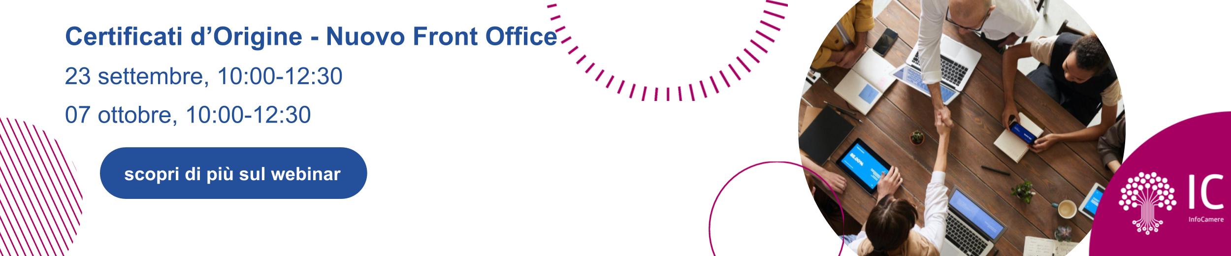 Nell'ambito delle attività sul Commercio Estero, in particolare sulle attività di on-boarding delle Imprese sull'utilizzo del Nuovo Front Office per la compilazione e l'invio dei Certificati d'Origine, Infocamere organizza due ulteriori webinar nel mese di settembre e ottobre, dedicati alle imprese.